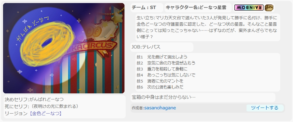 生い立ち:「YO!待たせたな、金色どーなつのレディ!ターボ全開、アーユーレディ?キメるぜ俺様、ドーナツターン!見ろよ、夜空のどーなつ星雲!俺も奴も、みんなを応援してるぜ!」