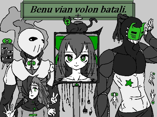 ・エスペラント語の意味:「戦う意志へ祝福を。」「Benu vian volon batali.」