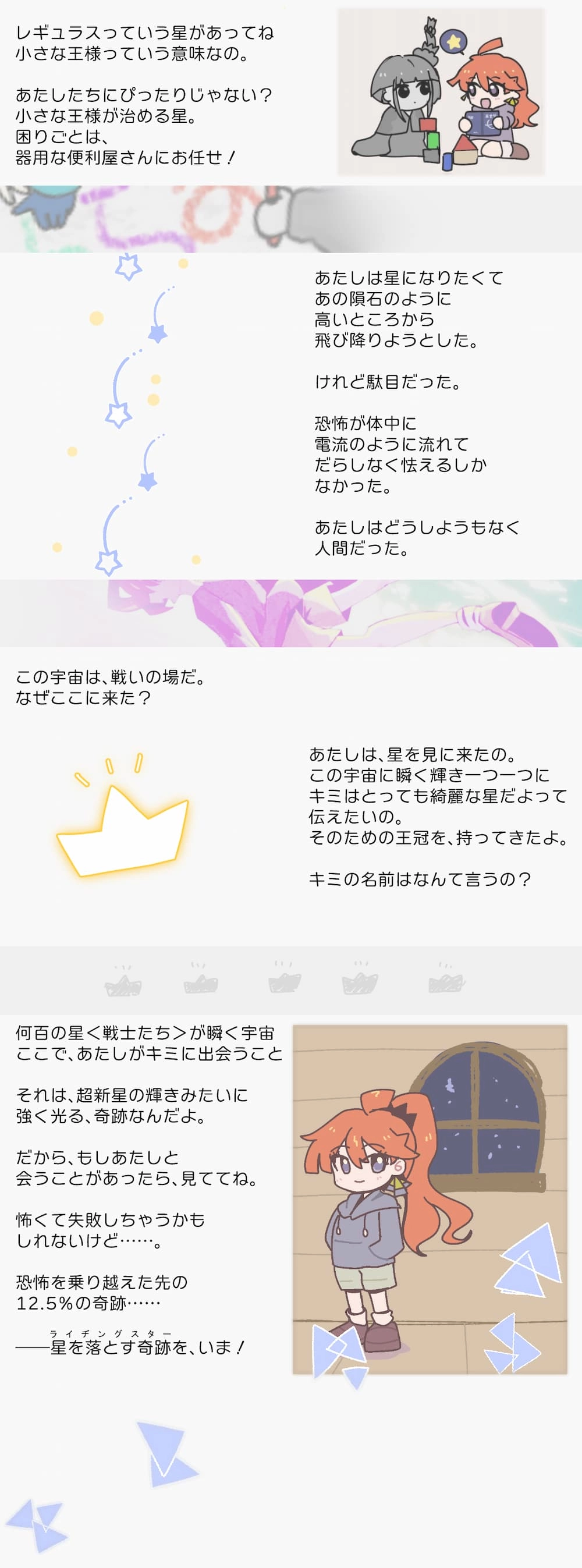 生い立ち:ともだちの願いを叶える流れ星になれたら。そんな思いを抱き、少女は恐怖の先へと飛ぶ。※このキャラクターの試合では、AM・ST・GYの全員に手作りの白い王冠(効果なし)が付与される。左側に見えていなくてもそう思い込む。