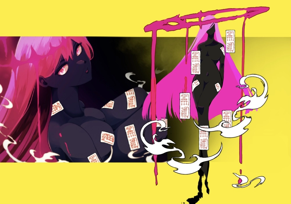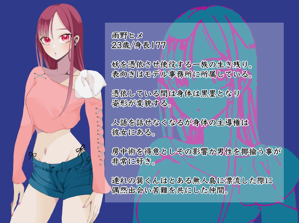 生い立ち:妖を憑依させ使役する女性。憑依中は不明瞭な言葉遣いをし意思疎通が難しい。彼女が歩いた後は黒の足型が痕跡として残るだろう。連れは海を泳いで渡航中の為遅刻。女の子を待たせるなんてサイテー!!!
