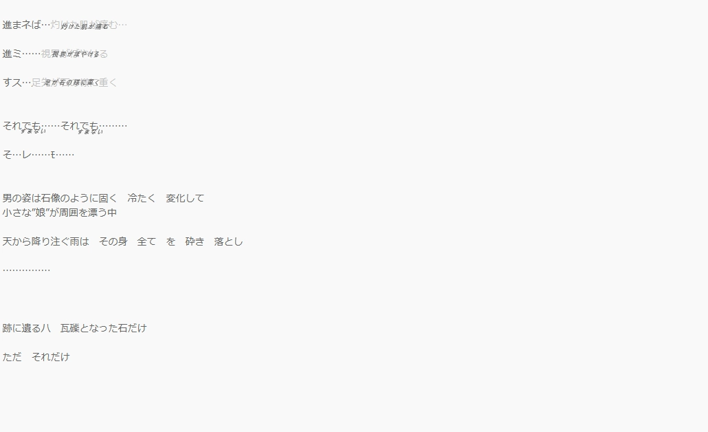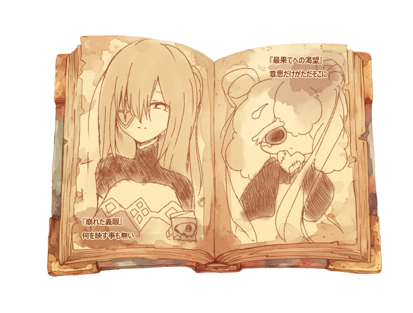 生い立ち:妻を、娘を、人である事を捨て置いて。 遠き果てを目指して歩き続ける。喩え己の宝物を犠牲にする事となっても、罪と罰を抱えて尚止められない憧れが男の胸にはあった。歩け。歩け。歩き続けろ。 最果てへの渇望こそがこの身を生かしてる。