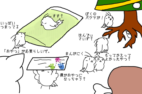 憩いの場で恐ろしい勢いでシェアされたからあげとかピザをすずめの代わりに食べてくれた食いしん坊