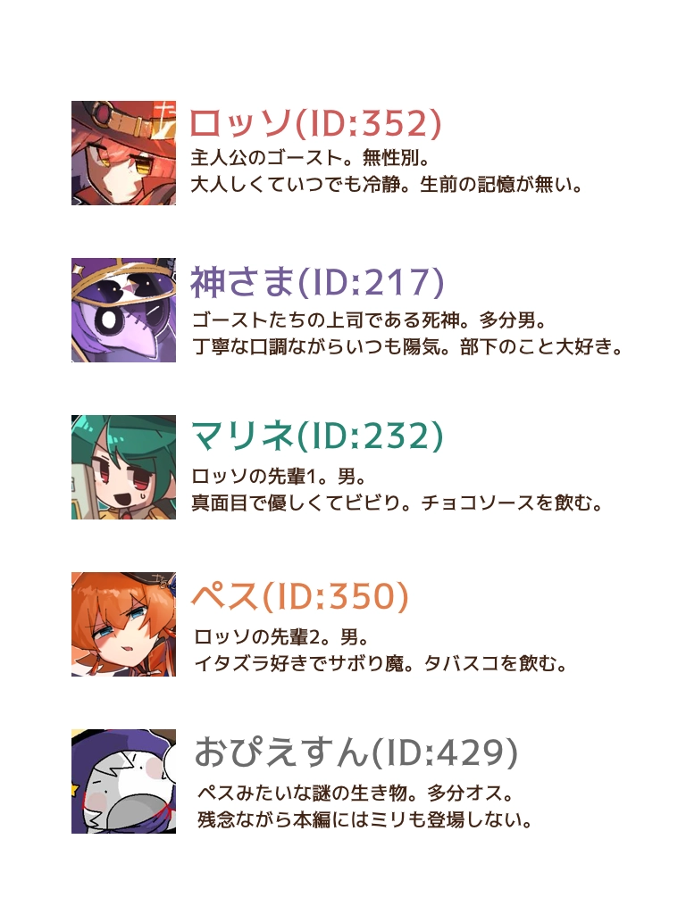 生い立ち:マリネです!ゴーストとして、死神の神さまの部下やってます。去年、たまたまペス君と参加したぽれんに、今年は神さまとロッソ君も誘ってみました。皆のこと守れるか不安だけど…リーダーなんだし、頑張らないと!では、あなたの最期のシンパンを始めます!